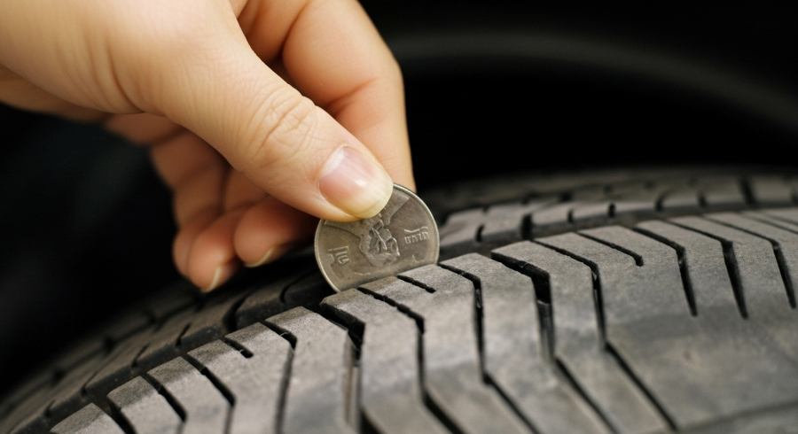 타이어 옆면을 잘 살펴보면 삼각형(▲) 표시를 찾을 수 있습니다. 이 표시가 가리키는 위쪽의 타이어 홈 안을 보면 살짝 튀어나온 '마모 한계선'이 있습니다. 타이어 표면이 이 마모 한계선(법적 한계 1.6mm)과 높이가 같아졌다면 즉시 타이어를 교체해야 합니다.
