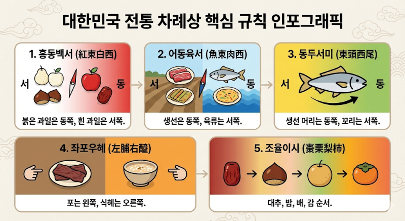 - 🐟 어동육서: 생선 요리는 오른쪽(동), 고기 요리는 왼쪽(서)입니다.