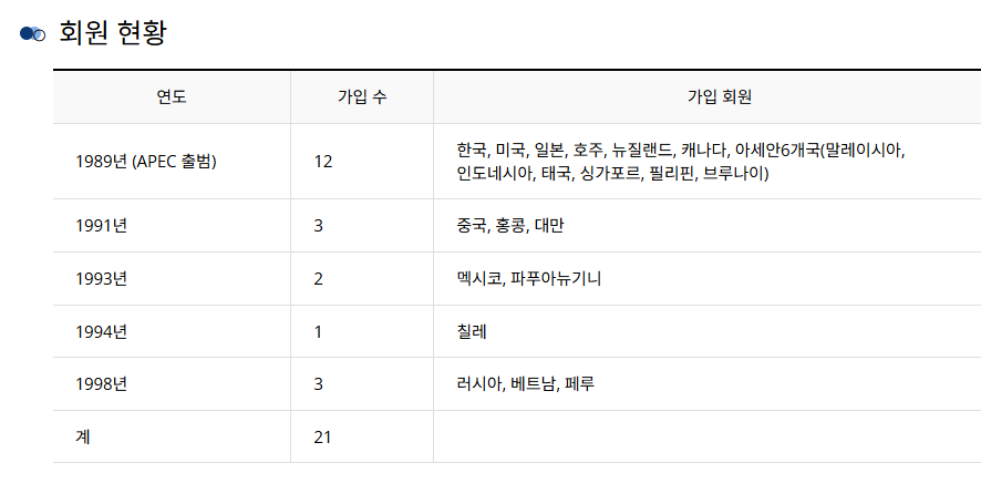 * 창설멤버 12개국 : 한국, 미국, 일본, 호주, 뉴질랜드, 캐나다, ASEAN 6개국(말레이시아, 인도네시아, 태국, 싱가포르, 필리핀, 브루나이)