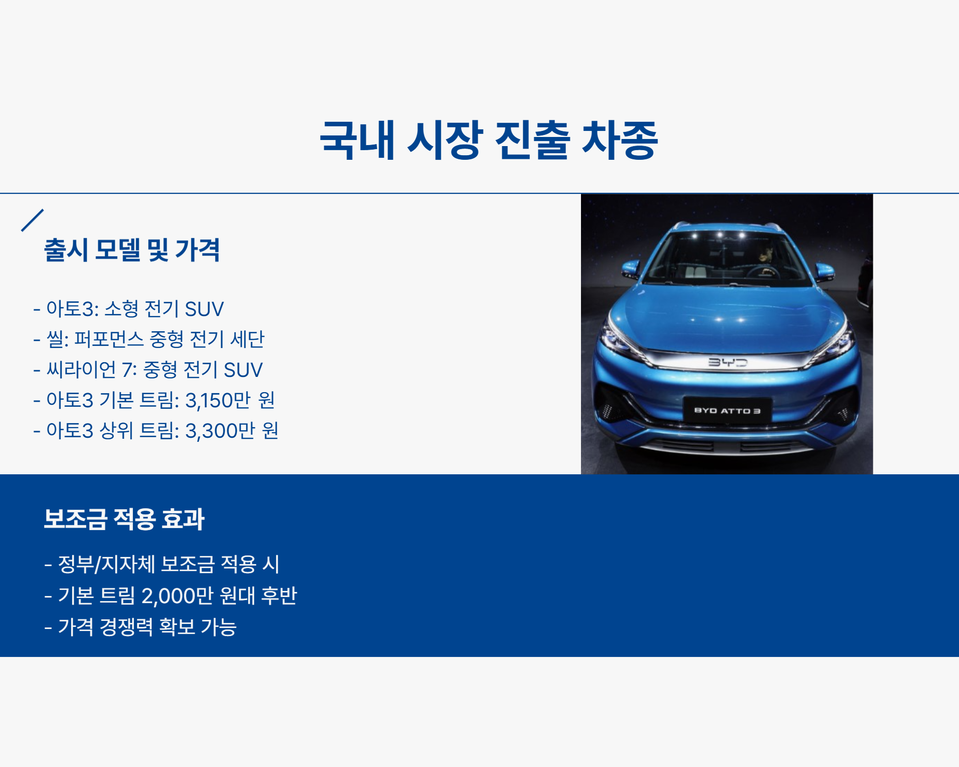 - 출시 모델: BYD는 소형 전기 SUV인 아토3(ATTO3)를 시작으로, 퍼포먼스 중형 전기 세단 씰(SEAL)과 중현 전기 SUV 씨라이언 7(SEALION 7)을 출시할 계획입니다.