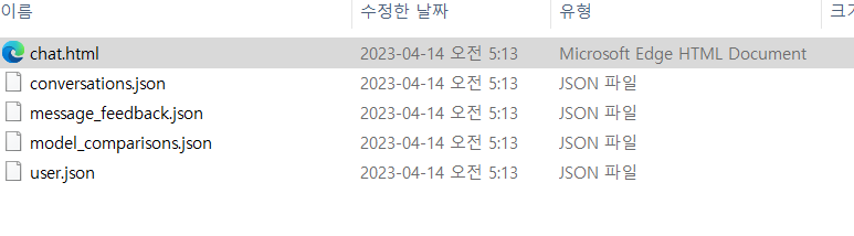 9. chat.html을 클릭하면 설정된 브라우저에서 지난 대화 web search 리스트를 포함하여 내용을 모두 볼 수 있습니다.